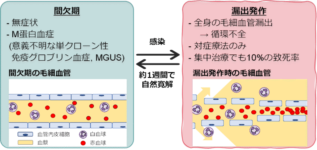 現在研究の主眼としている疾患は、特発性全身性毛細血管漏出症候群(クラークソン病)です。年間何人の患者さんが新たに生じているかも不明な超稀少疾患ですが、ウイルス感染などをきっかけに全身のCLSを来たす致死的な疾患です。